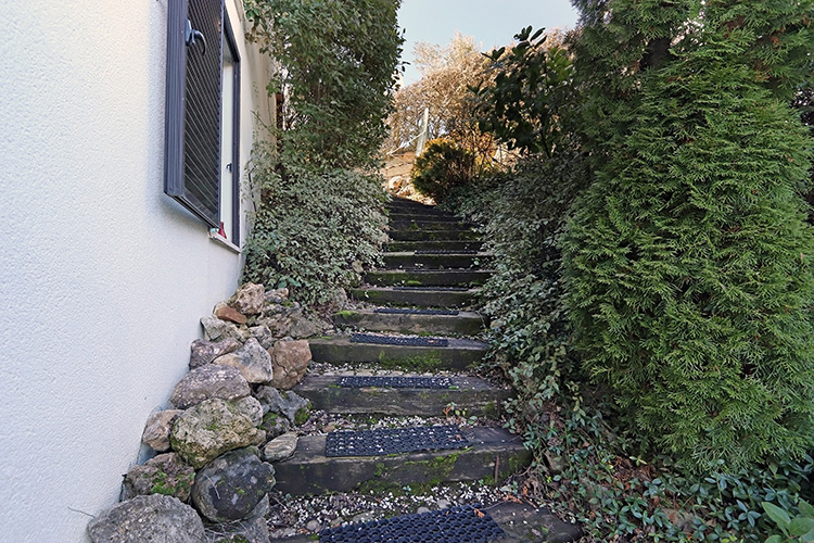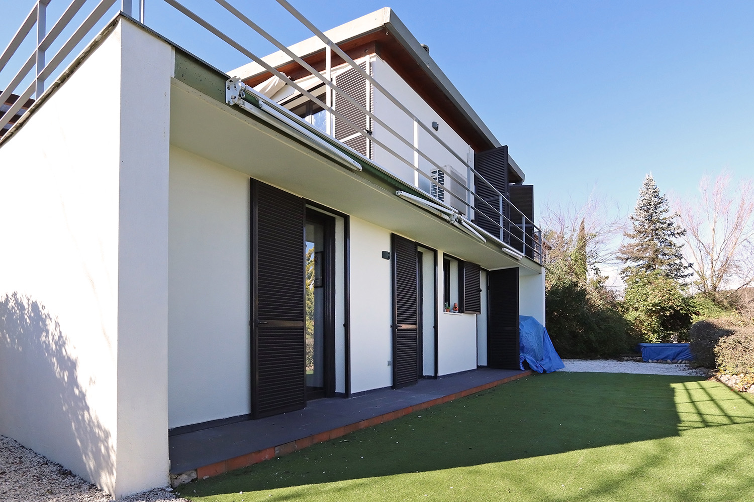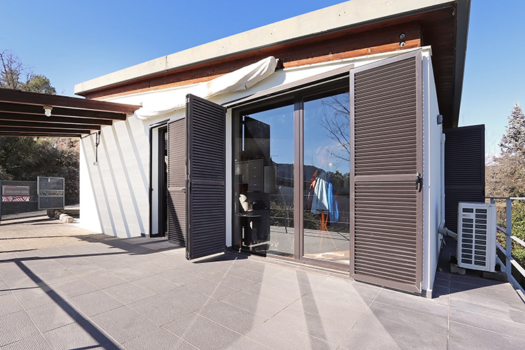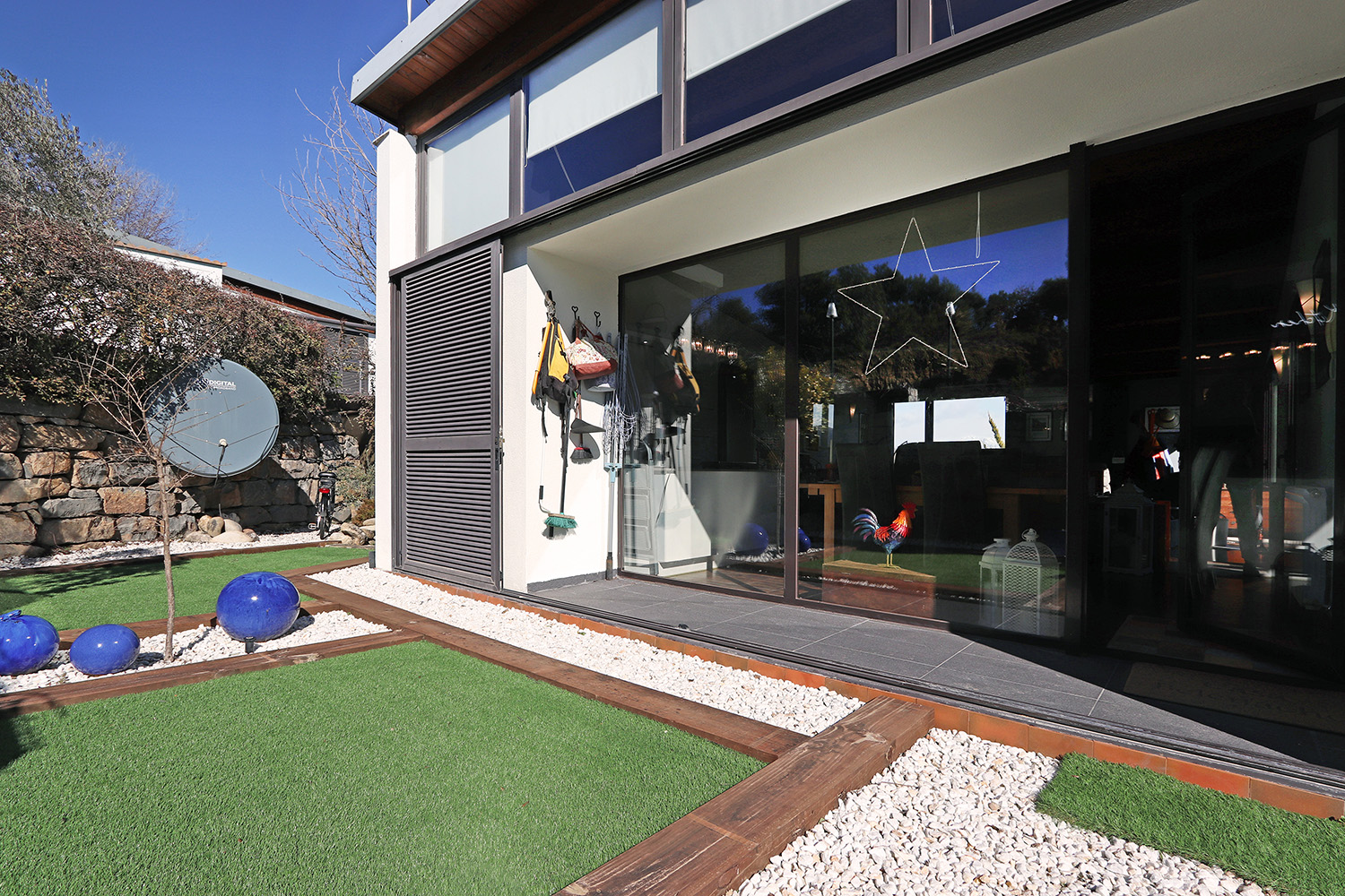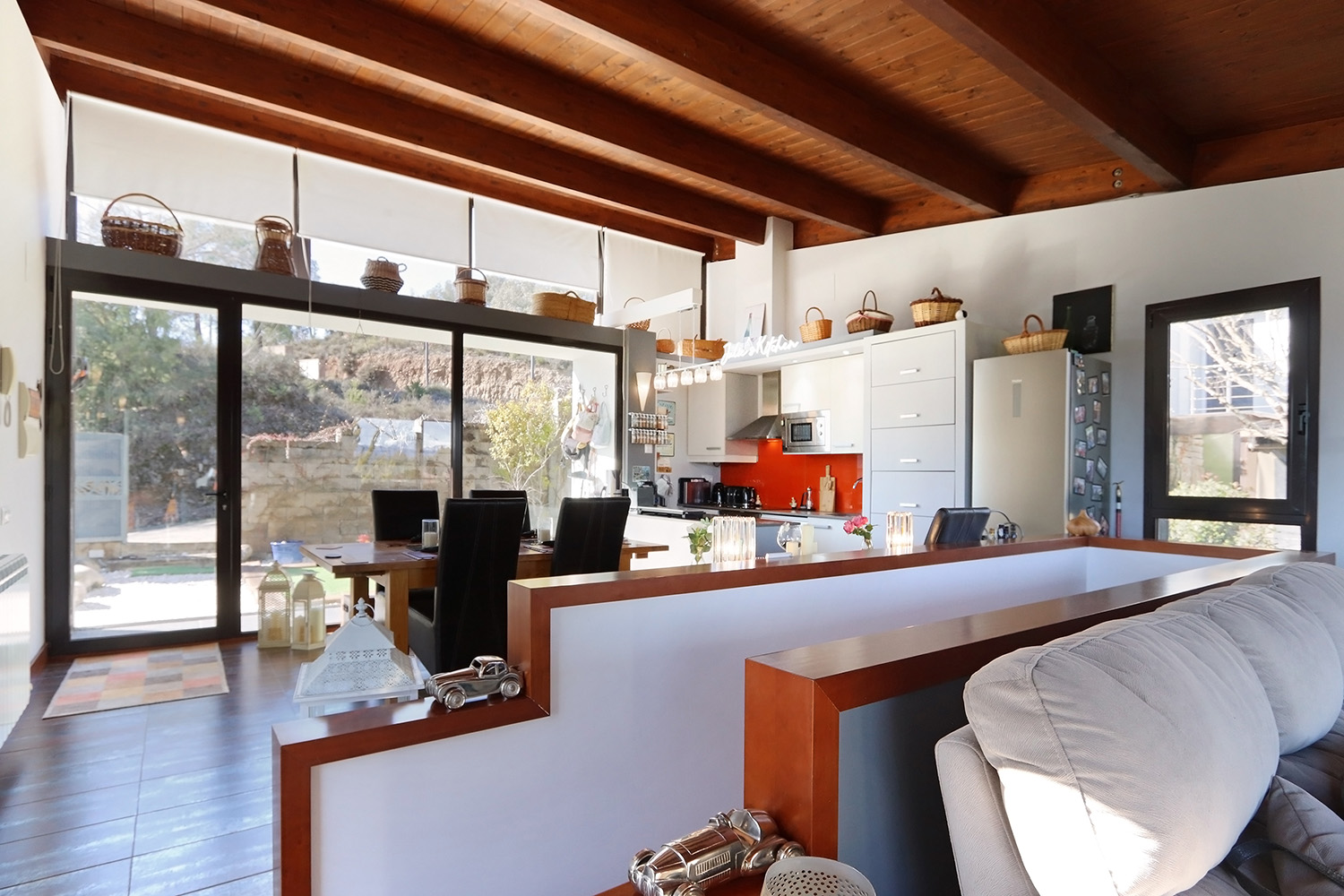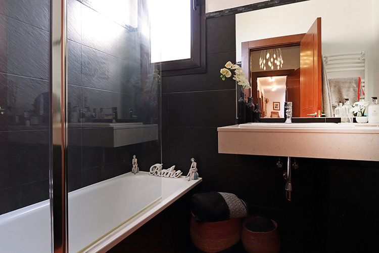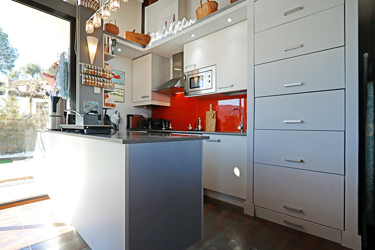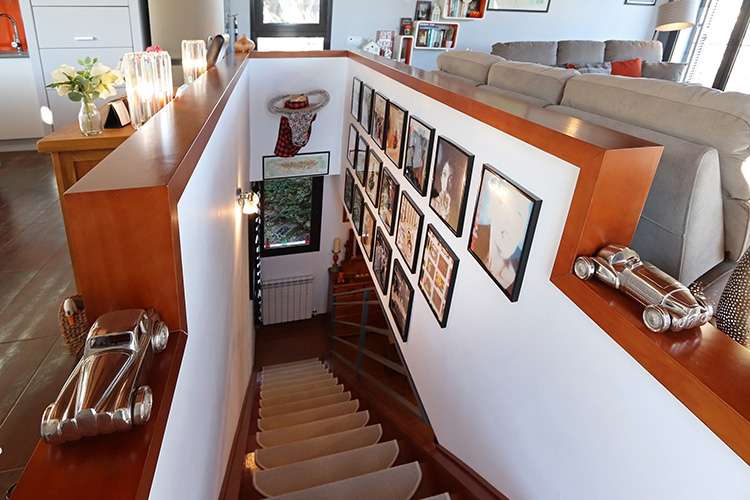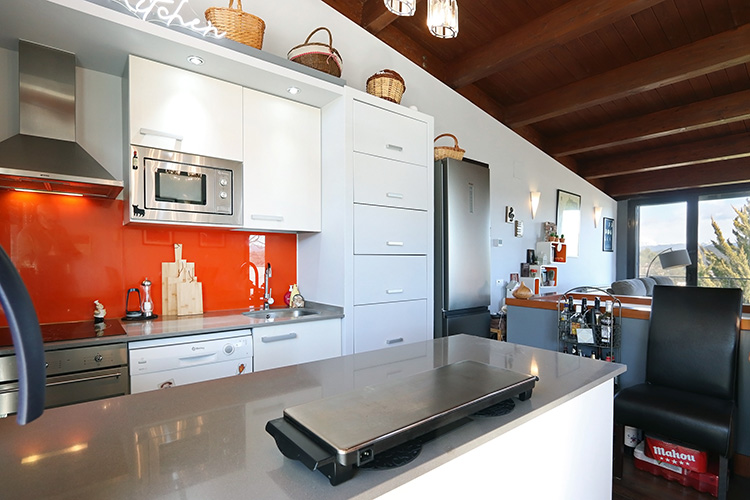 The house consists of two floors. The entrance on the upper floor provides access to a spacious open-plan living room, dining room and kitchen. The ground floor consists of three bedrooms and two bathrooms. This layout keeps the bedrooms nice and cool and offers a fantastic view from the living room.