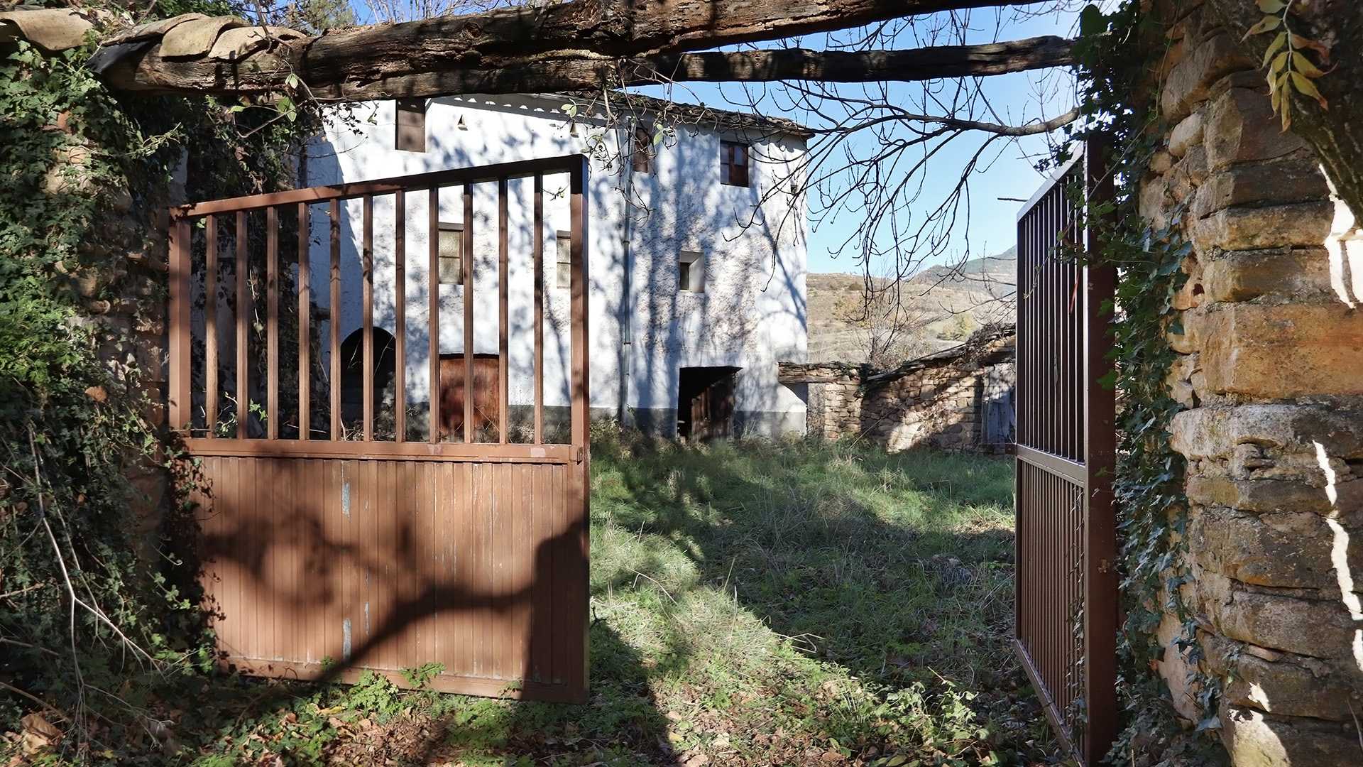 La casa, con vigas de madera originales, paredes de piedra natural y varios edificios anexos alrededor de un patio interior, respira el ambiente de una casa rural tradicional.